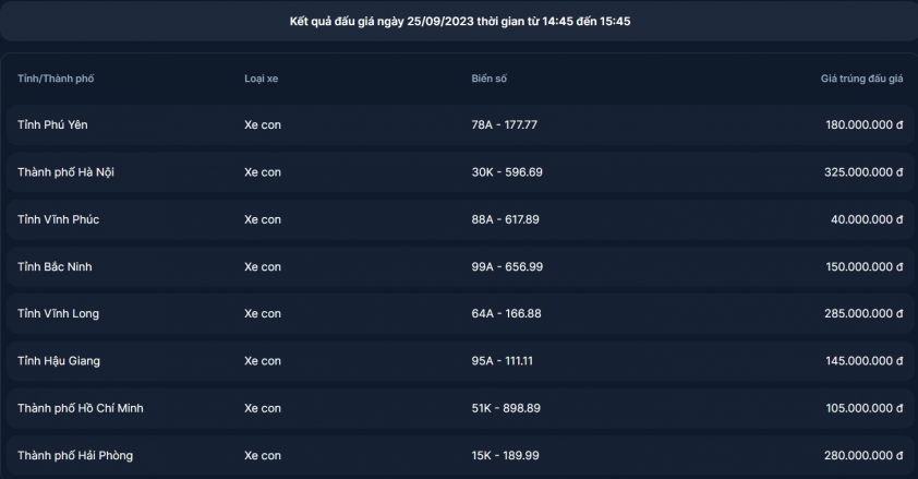 Trong chiều nay 25/9, Công ty Đấu giá hợp danh Việt Nam tiếp tục đưa ra đấu giá 23 biển số ô tô đẹp trong 3 khung giờ.
