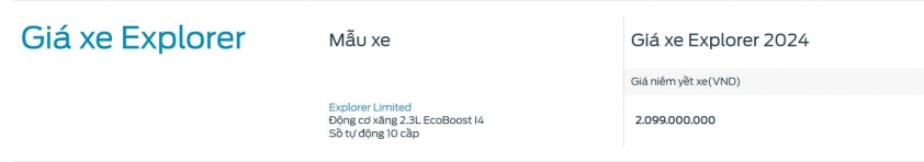 Cụ thể, Ford Explorer được điều chỉnh giá bán lên thành 2,099 tỷ đồng từ mốc 1,999 tỷ đồng, tăng 100 triệu đồng so với trước đây. Nguyên nhân điều chỉnh giá bán không được tiết lộ.
