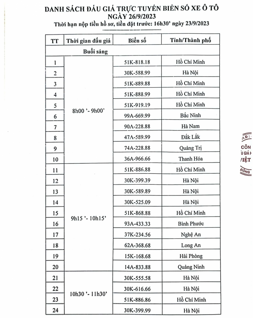 Sáng nay 26/9, Công ty Đấu giá hợp danh Việt Nam tiếp tục đưa ra đấu giá 30 biển số ô tô “hàng độc” trong 3 khung giờ.