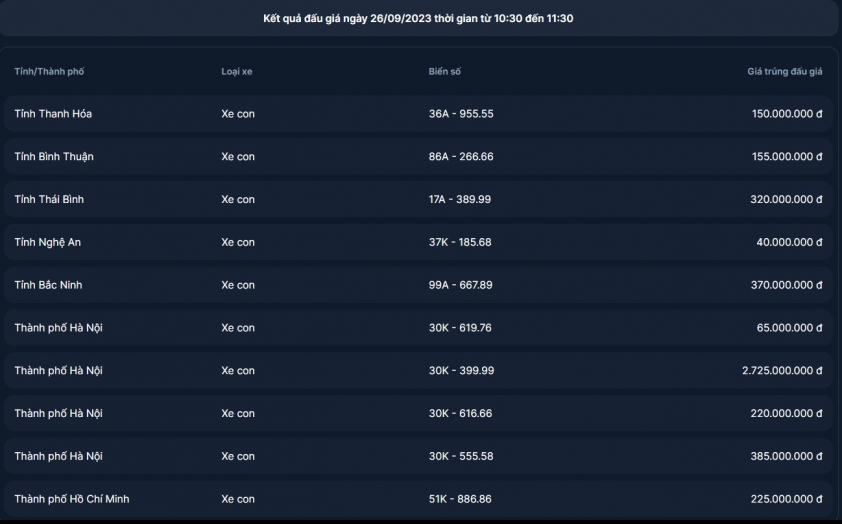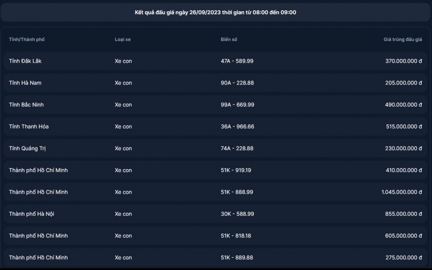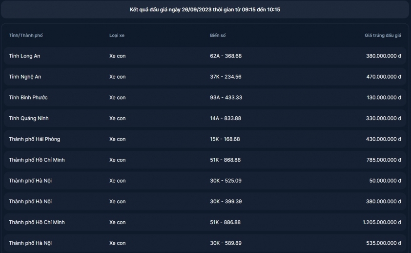 Kết quả phiên đấu giá biển số sáng 26/9: