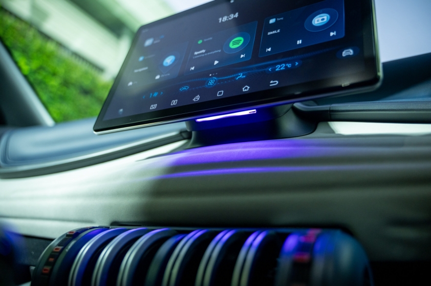 Bên trong, khoang lái được trang trí theo phong cách phối hai tông màu với hai tùy chọn là màu xám-xanh và màu xanh-đen. Ngoài ra, màn hình trung tâm đã được nâng cấp. Từ kích thước ban đầu là 12.8 inches, kích thước mới đã tăng lên mức 15.6 inches và có thể quay ở tất cả các hướng.