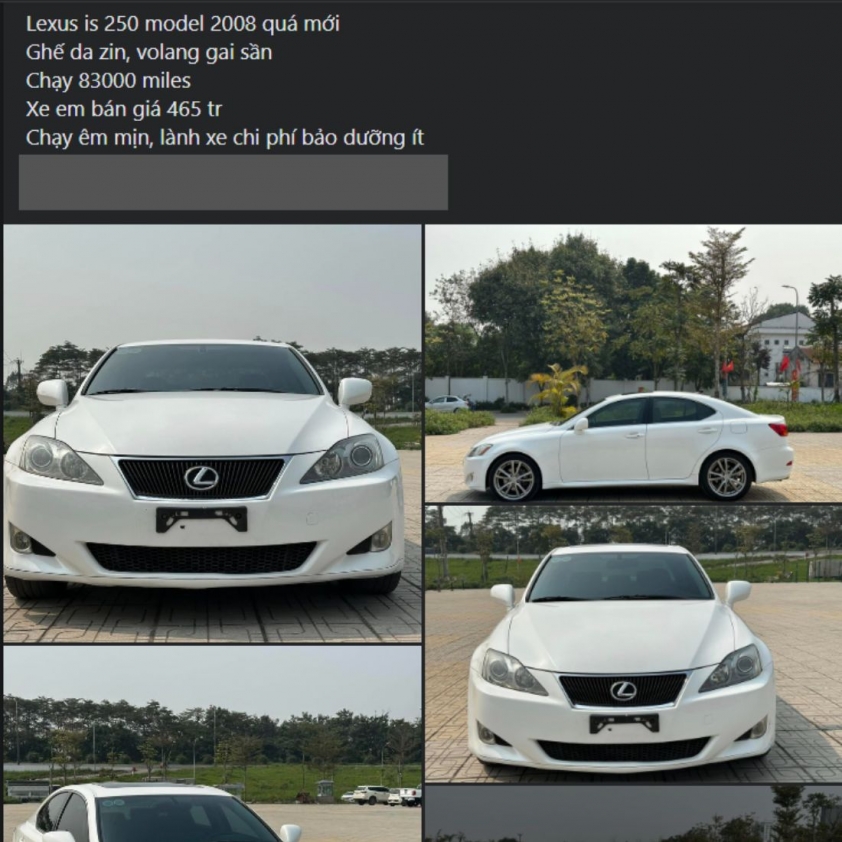 Tham khảo thị trường xe đã qua sử dụng, một chiếc Lexus IS 250 sản xuất năm 2008 hiện được bán với giá chỉ 465 triệu đồng.