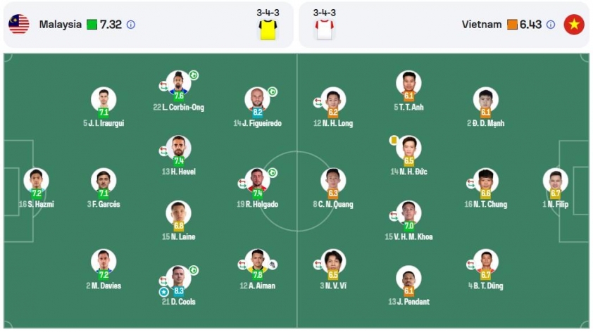 Người được chấm điểm cao nhất ĐT Việt Nam là tiền vệ Võ Hoàng Minh Khoa với số điểm 7,0. Cầu thủ thuộc biên chế của Bình Dương bất ngờ xuất phát chính, nhiều dự đoán trước đó cho rằng Đức Chiến mới là lựa chọn hợp lý hơn đá cặp với Hoàng Đức.