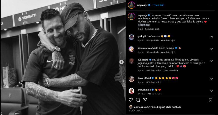 Neymar đã đăng một thông điệp chia tay Lionel Messi trên mạng xã hội sau khi M10 quyết định chia tay PSG sau mùa bóng 2022/23.