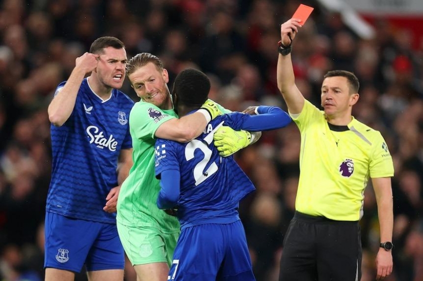 Tâm điểm của trận đấu chắc chắn thuộc về tấm thẻ đỏ kỳ lạ của Idrissa Gana Gueye. Sau khi mất bóng trong vòng cấm và để Bruno Fernandes tung cú sút vọt xà, Gueye quay sang trách móc đồng đội Michael Keane. Hai người lời qua tiếng lại, rồi Gueye bất ngờ tát vào mặt người đồng đội Michael Keane, một hành vi bị phạt thẻ đỏ trực tiếp theo đúng luật. Jordan Pickford thậm chí phải “hộ tống” người đồng đội đang nóng nảy vào thẳng đường hầm.