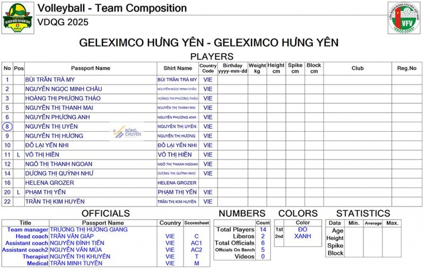 Danh sách cầu thủ Geleximco Hưng Yên giai đoạn 2 giải bóng chuyền VĐQG 2025