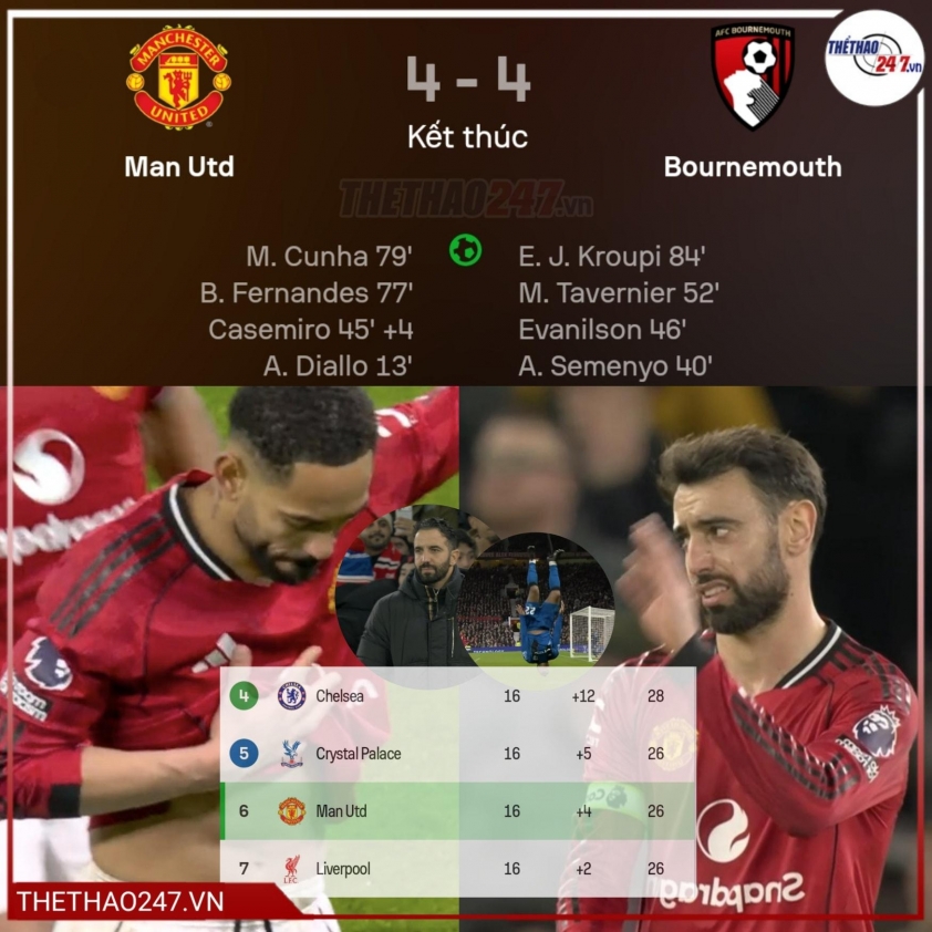 Manchester United và Bournemouth vừa tạo ra một trận đấu giàu cảm xúc tại Old Trafford, nơi đội chủ nhà ba lần vươn lên dẫn trước nhưng không thể giữ được chiến thắng. Trận đấu khép lại với tỷ số 4-4, kết quả khiến khán đài rơi vào trạng thái hỗn độn giữa phấn khích và thất vọng. Dù hàng công thể hiện khả năng ghi bàn ấn tượng, những khoảng trống nơi hàng thủ một lần nữa khiến Man Utd phải trả giá.