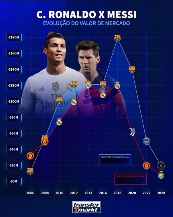 Với Cristiano Ronaldo, sự tụt giá còn rõ rệt hơn. Đỉnh cao định giá của anh rơi vào năm 2014 với con số 120 triệu Euro trong màu áo Real Madrid, khi anh liên tục ghi bàn, giành Champions League và Quả bóng vàng. Thời điểm đó, Ronaldo luôn nằm trong nhóm đắt giá nhất thế giới. Nhưng hiện tại, giá trị chuyển nhượng của anh chỉ quanh mốc 12 triệu Euro. Tuổi tác, giải đấu anh đang thi đấu và hợp đồng đặc thù tại Saudi Arabia khiến con số này sụt giảm mạnh, dù mức độ ảnh hưởng về mặt thương hiệu và sức hút khán giả vẫn ở tầm hàng đầu thế giới.