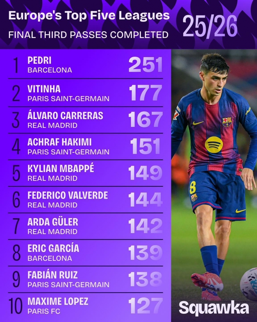 Ở La Liga, Pedri đã thực hiện 711 đường chuyền thành công, nhiều hơn tới 167 so với người xếp thứ hai là Alvaro Carreras (544). Sự khác biệt này khẳng định sự áp đảo tuyệt đối của anh trong khả năng luân chuyển bóng. Flick đánh giá cao vai trò toàn diện của cậu học trò: “Cậu ấy thật đặc biệt. Cậu ấy mang đến sự lãnh đạo, xuất hiện ở khắp mọi nơi trên sân và có thể trải qua một mùa giải ngoạn mục”.