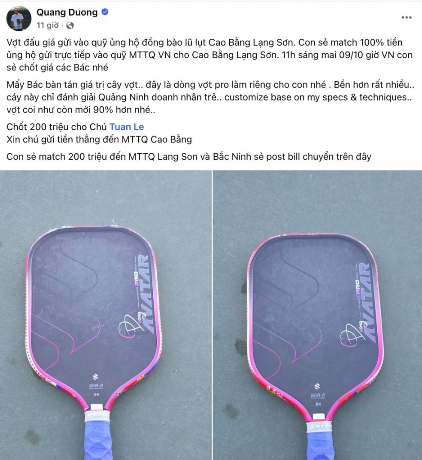 Trong bài đăng trên mạng xã hội, Quang Dương chia sẻ: “Vợt đấu giá gửi vào quỹ ủng hộ đồng bào lũ lụt Cao Bằng, Lạng Sơn. Tôi sẽ chuyển 100% tiền ủng hộ gửi trực tiếp vào quỹ MTTQ Việt Nam”. Anh cho biết cây vợt được thiết kế riêng cho mình bởi hãng Sypik, với độ bền và hiệu suất cao hơn bản thương mại. Cây vợt này được làm từ lõi QuantumCore giúp tăng lực đánh, kết hợp mặt carbon T700 4D cho khả năng kiểm soát bóng tinh tế, đạt chứng nhận URA-A để đủ tiêu chuẩn thi đấu quốc tế.