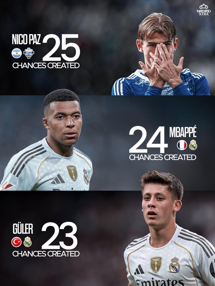 Thế nhưng, phong độ chói sáng của Nico Paz tại Serie A đang khiến ban lãnh đạo Real Madrid phải suy nghĩ lại. Trong màu áo Como 1907, cầu thủ người Argentina đã trở thành điểm sáng của đội bóng tân binh. Ở tuổi 19, anh ra sân 8 trận trên mọi đấu trường, ghi 4 bàn và kiến tạo 4 lần. Đáng chú ý, Paz còn dẫn đầu châu Âu về số cơ hội tấn công tạo ra (25 lần), vượt qua cả Kylian Mbappe (24) và Arda Guler (23).