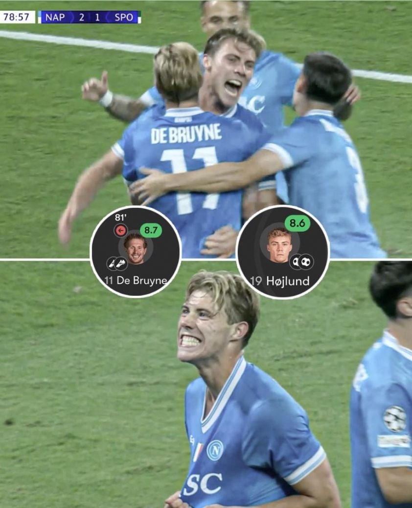Ở một diễn biến khác tại sân Diego Armando Maradona, Rasmus Hojlund cũng có màn tỏa sáng rực rỡ. Tiền đạo trẻ người Đan Mạch ghi cả hai bàn trong chiến thắng 2-1 của Napoli trước Sporting. Phút 36, từ pha phát động phản công của Kevin De Bruyne, Hojlund thoát xuống dứt điểm lạnh lùng mở tỷ số. Đến phút 81, anh hoàn tất cú đúp bằng một pha đánh đầu dũng mãnh, cũng từ đường chuyền của De Bruyne. Đây là bàn thắng thứ 3 của Hojlund kể từ khi khoác áo Napoli, chấm dứt chuỗi 3 trận tịt ngòi trước đó.