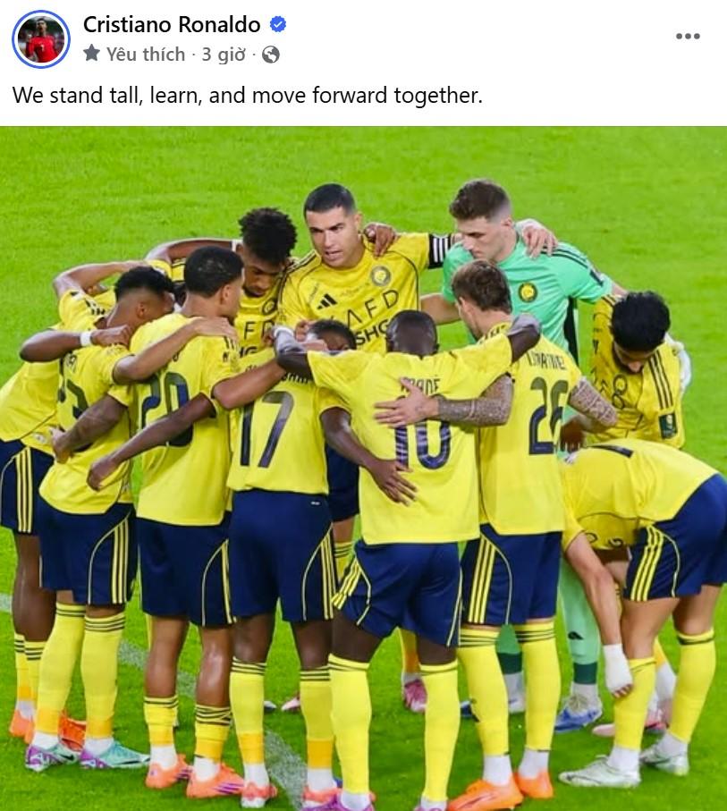 Sau trận thua, trên trang cá nhân của mình, Ronaldo đã chia sẻ một bài đăng đầy ý nghĩa với lời nhắn: “We stand tall, learn, and move forward together” (Chúng tôi đứng vững, học hỏi và tiến về phía trước cùng nhau). Đây là một thông điệp rõ ràng từ Ronaldo, không chỉ là sự động viên cho đồng đội mà còn là lời khích lệ để vượt qua thất bại và tiếp tục chiến đấu vì những mục tiêu lớn.