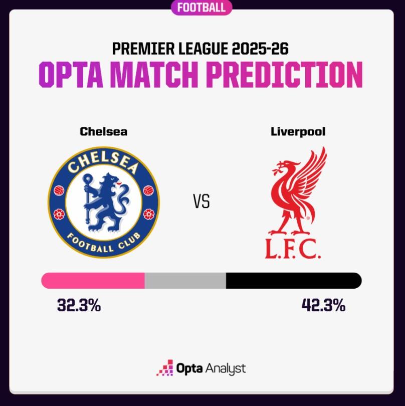 Theo máy tính Opta, Liverpool có 42,3% cơ hội giành chiến thắng trước Chelsea tại Stamford Bridge, trong khi cơ hội của The Blues chỉ dừng lại ở mức 32,3%, phần còn lại là khả năng hòa.