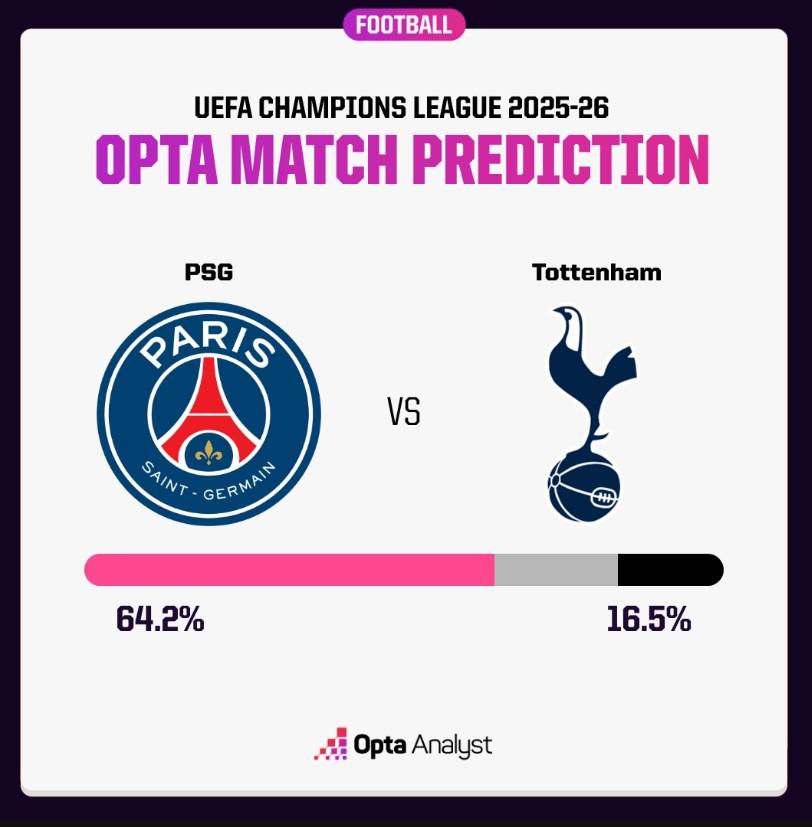 Siêu máy tính Opta đánh giá PSG vượt trội Tottenham khi trận đại chiến tại Parc des Princes sắp diễn ra, với tỷ lệ chiến thắng nghiêng mạnh về nhà ĐKVĐ Champions League.
