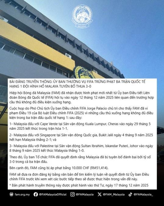 Ngày 17/12/2025, Ủy ban Kỷ luật Liên đoàn Bóng đá Quốc tế chính thức ra phán quyết liên quan đến vụ việc sử dụng cầu thủ không đủ điều kiện của Liên đoàn Bóng đá Malaysia. Theo đó, FIFA xác định FAM đã vi phạm Điều 19 của Bộ luật Kỷ luật FIFA phiên bản 2025 và tuyên bố đội tuyển Malaysia thua 0-3 trong cả ba trận giao hữu quốc tế cấp độ 1 đã diễn ra trong năm nay, đồng thời áp dụng mức phạt tiền 10.000 CHF.