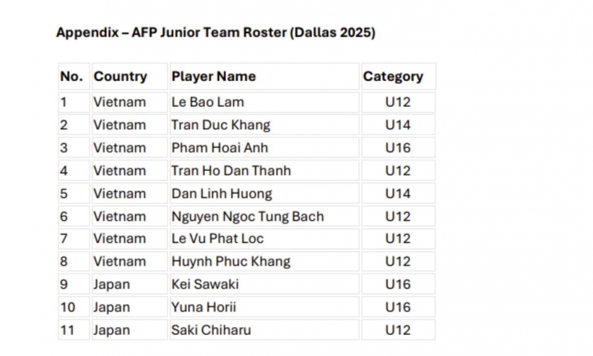 Đội trẻ AFP gồm 11 vận động viên được tuyển chọn kỹ lưỡng từ các quốc gia có phong trào pickleball phát triển mạnh, trong đó Việt Nam chiếm số lượng vượt trội với 8 gương mặt. Danh sách gồm Lê Bảo Lâm, Trần Đức Khang, Phạm Hoài Anh, Trần Hồ Đan Thanh, Đan Linh Hương, Nguyễn Ngọc Tùng Bách, Lê Vũ Phát Lộc và Huỳnh Phúc Khang. Ba vận động viên còn lại đến từ Nhật Bản là Kei Sawaki, Yuna Horii và Saki Chiharu. Các tay vợt trẻ sẽ tranh tài ở các nội dung Đơn nam, Đơn nữ, Đôi nam nữ và tham dự trận giao hữu đặc biệt giữa Đội châu Á và Đội Mỹ mang tên “Team Asia vs Team USA Junior Showcase”.
