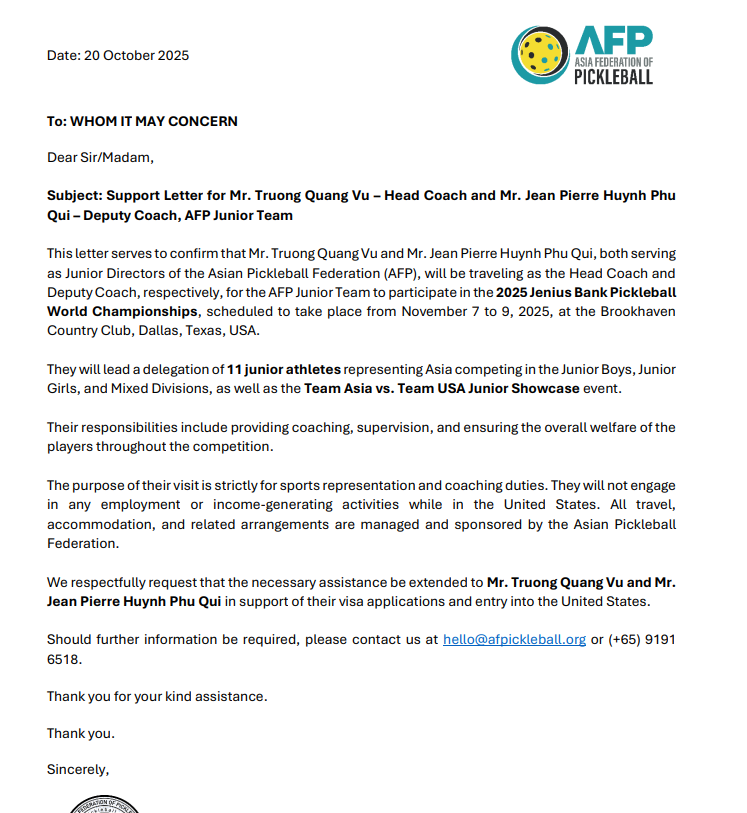 Liên đoàn Pickleball châu Á vừa xác nhận việc cử ông Trương Quang Vũ và ông Jean Pierre Huỳnh Phú Quí làm huấn luyện viên trưởng và trợ lý huấn luyện viên của đội trẻ AFP tham dự giải thế giới. Giải đấu sẽ diễn ra từ ngày 7 đến 9 tháng 11 năm 2025 tại Câu lạc bộ Brookhaven Country Club ở Dallas, Texas, Hoa Kỳ, quy tụ các tay vợt trẻ xuất sắc nhất toàn cầu.