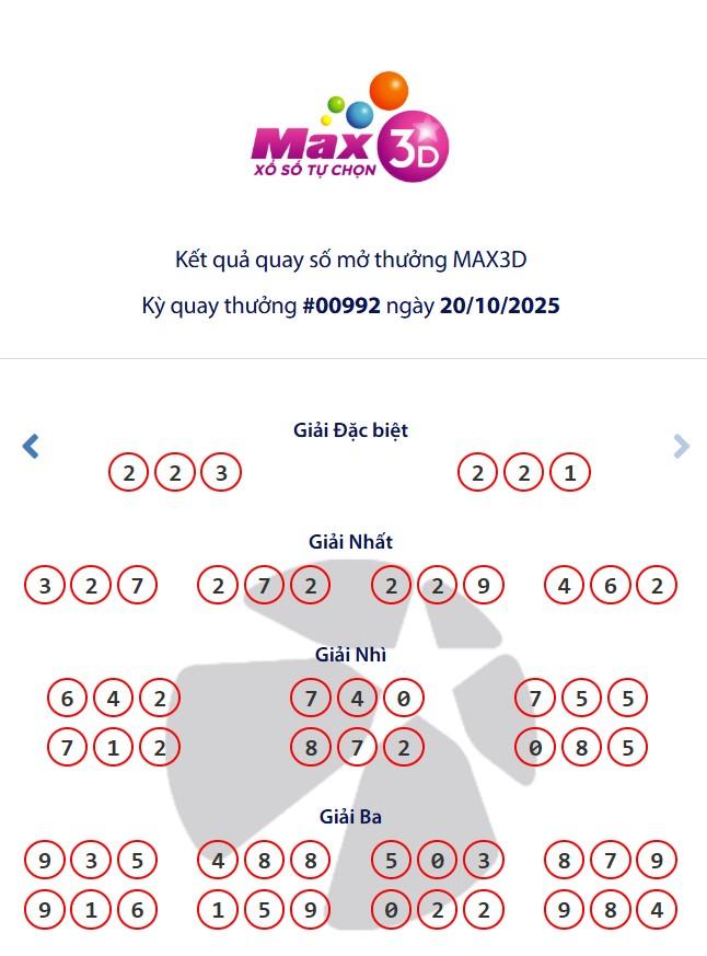 Vietlott 20/10/2025 - Kết quả xổ số Vietlott Max 3D ngày 20/10/2025