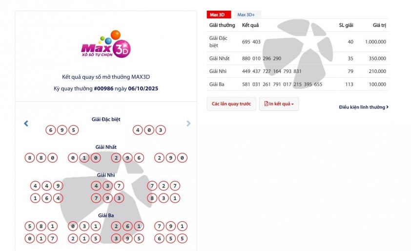 Vietlott 6/10/2025 - Kết quả xổ số Vietlott Max 3D ngày 6/10/2025