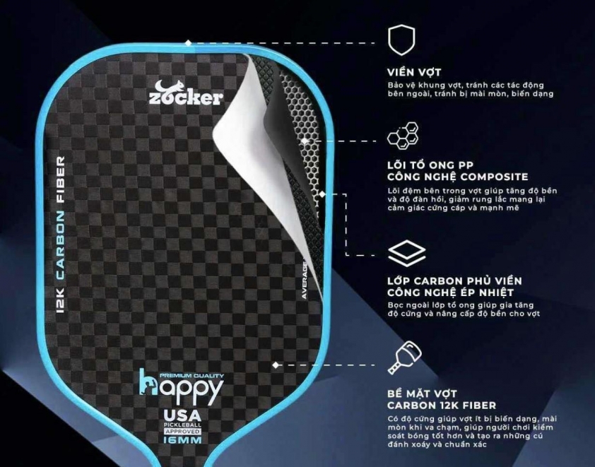 Zocker Happy HP3 Premium Quality Blue phù hợp với người chơi muốn nghiêm túc phát triển kỹ năng, chú trọng vào độ chính xác và cảm giác bóng. Thiết kế đẹp, vật liệu bền và khả năng thi đấu ổn định giúp cây vợt này trở thành lựa chọn đáng tin cậy cho những ai yêu thích sự cân bằng giữa sức mạnh và kỹ thuật trên sân pickleball.