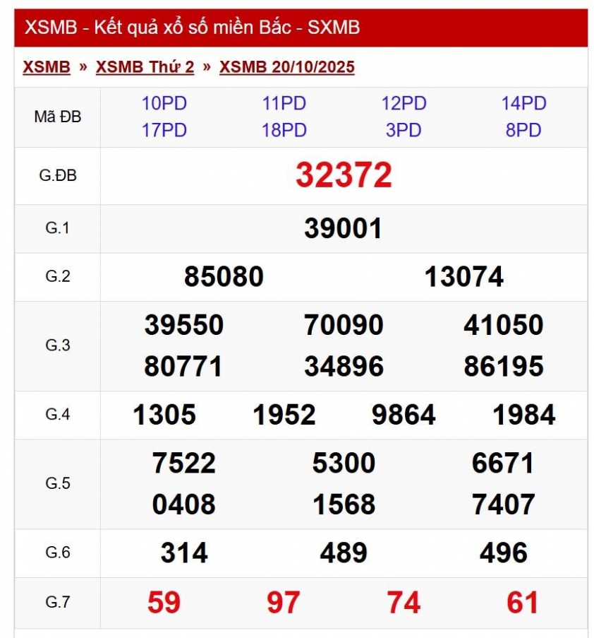 XSMB 20/10/2025 - Kết quả xổ số miền Bắc hôm nay 20/10/2025