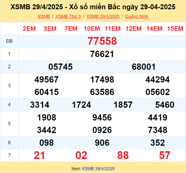 Kết quả xổ số miền Bắc (XSMB) ngày 29/04