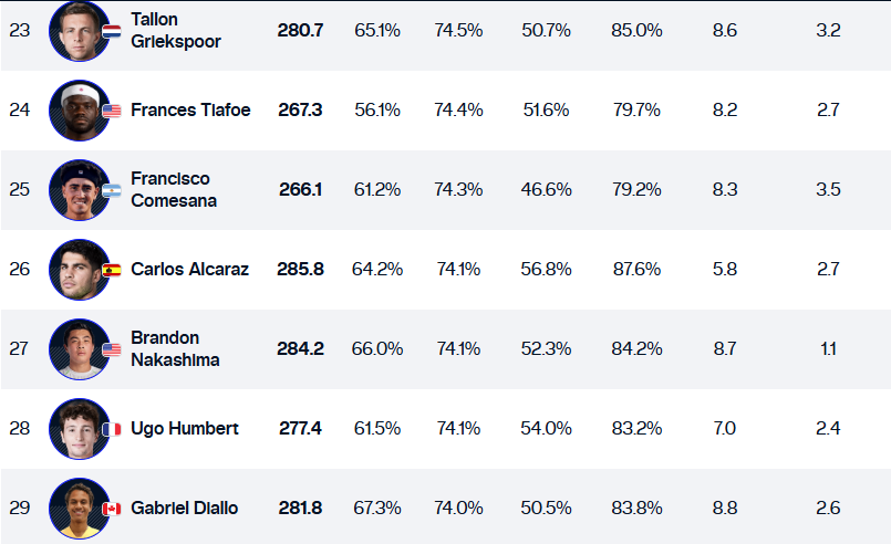 Hiệu quả của Sinner được thể hiện rõ nhất ở tỉ lệ giữ game giao bóng với con số 92%, cao nhất ATP Tour 2025. Alcaraz đứng thứ 6 ở thống kê này, nhưng có một điểm đáng lo hơn: anh chỉ xếp thứ 26 về tỉ lệ điểm giao bóng một giành được - yếu tố mà tay vợt Tây Ban Nha cần cải thiện trong thời gian tới.