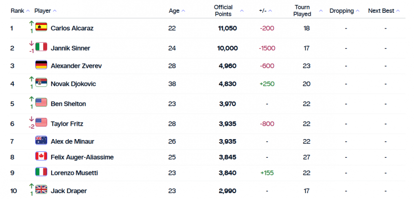 Ben Shelton cũng leo lên vị trí thứ 5 thế giới - thứ hạng tốt nhất sự nghiệp sau khi đương kim á quân ATP Finals - Taylor Fritz bị trừ 800 điểm với lí do tương tự và tụt xuống hạng 6. Jack Draper trở lại top 10 dù đã không thi đấu kể từ Wimbledon, trong khi 3 vị trí còn lại trong top 10 (hạng 7-9) được giữ nguyên, lần lượt thuộc về Alex De Minaur, Felix Auger-Aliassime và Lorenzo Musetti.