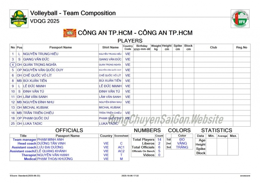 Danh sách cầu thủ Công an TPHCM giải bóng chuyền VĐQG 2025