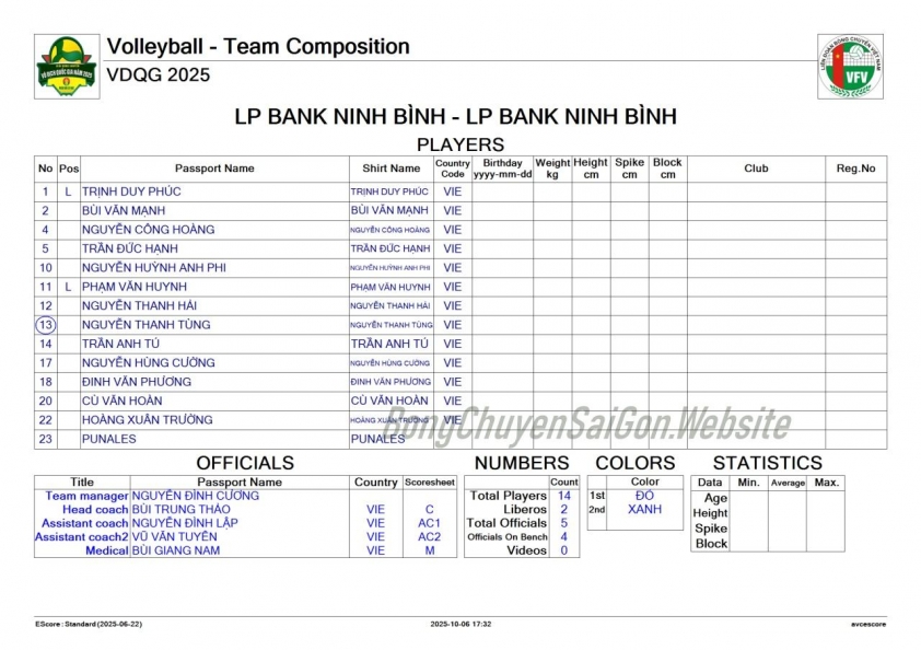Danh sách cầu thủ LPB Ninh Bình giải bóng chuyền VĐQG 2025