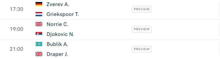 Trong khi đó, Novak Djokovic sau chiến thắng dễ dàng trước Filip Misolic sẽ đối diện với bài test thể lực hạng nặng mang tên Cameron Norrie - cựu số 8 thế giới người Anh vốn nổi tiếng "pin trâu". Đương kim á quân Alexander Zverev được dự báo sẽ gặp khó trước Tallon Griekspoor, trong khi hạt giống số 5 Jack Draper sẽ chạm trán tay vợt giải trí nhất trên Tour hiện tại - Alexander Bublik.