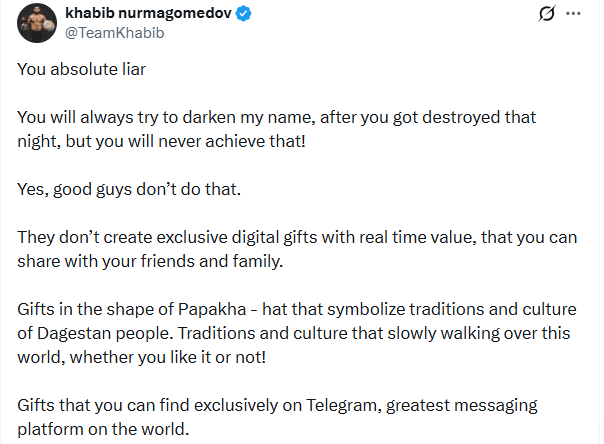 Khabib lập tức phản hồi mạnh mẽ, cáo buộc "Gã điên" làm mọi cách để bôi nhọ danh tiếng anh sau thất bại tại UFC 229. "Đồ dối trá. Mày luôn cố gắng bôi nhọ tên tao sau khi bị hủy diệt đêm đó, nhưng mày sẽ không bao giờ làm được!", Khabib viết. Anh tiếp tục giải thích rằng NFT Papakhas là những món quà kĩ thuật số độc quyền mô phỏng chiếc mũ truyền thống của người Dagestan, nhằm lan tỏa văn hóa chứ không phải nhằm mục đích lừa đảo.