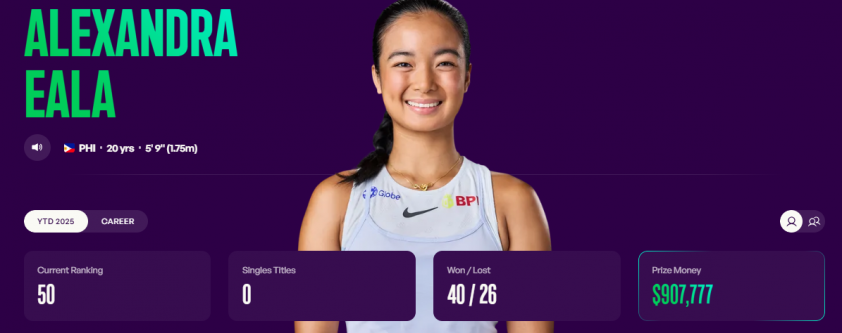 Tuần trước, Eala đạt thứ hạng cao nhất trong sự nghiệp - hạng 51 thế giới. Một chiến thắng tại giải WTA 250 ở Hồng Kông đã giúp tay vợt từng là học viên lò Rafa Nadal đủ điểm để vươn lên vị trí thứ 50 trong BXH WTA công bố đầu tuần này. Dù phải dừng bước ở vòng 1/8 trước Victoria Mboko - người sau đó đã lên ngôi vô địch, kết quả này là đủ giúp sao trẻ 20 tuổi này đi vào lịch sử thể thao Philippines.