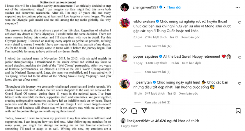 "Tôi đã quyết định sẽ khép lại sự nghiệp thi đấu quốc tế. Tôi có thể tưởng tượng các fan của tôi sẽ ngỡ ngàng với thông tin này. Sau tất cả, tôi mới chỉ 27 tuổi, rất nhiều người mong đợi tôi sẽ tiếp tục thi đấu tới kì Olympic tại Los Angeles (2028) hoặc lâu hơn. Chúng tôi (gồm Huang Yaqiong) mới giành HCV Thế vận hội và vẫn đang nằm trong top đầu BXH thế giới. Vậy tại sao tôi phải dừng lại? Câu trả lời rất đơn giản: đó là một phần trong hành trình của cuộc đời tôi. Ngay cả khi không hiện thực hóa giấc mơ ở Olympic Paris, tôi vẫn sẽ đưa ra quyết định tương tự [...]", trích một phần trong tâm thư rất dài của Zheng Siwei trên trang Instagram cá nhân.