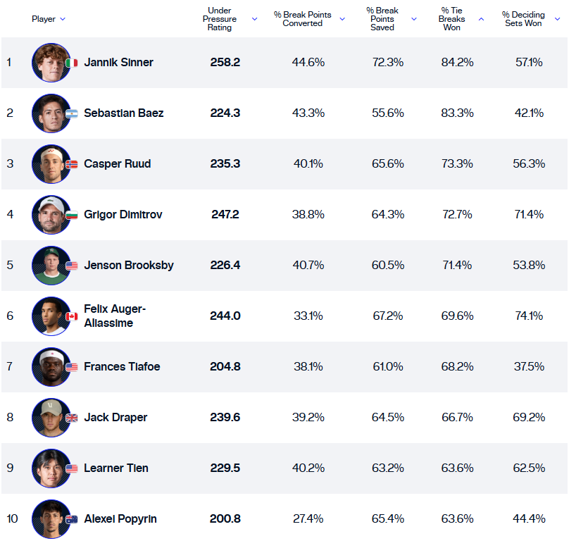 Trong môi trường thi đấu khốc liệt, việc kéo các tay vợt top đầu vào thế 6-6 vốn đã khó, nhưng nếu làm được, đối thủ vẫn phải đối diện một Sinner ở đẳng cấp khác. Tay vợt số 2 thế giới đã giành 17 chiến thắng và chỉ thua 3 trong các loạt tie-break mùa này, đạt tỉ lệ ấn tượng 84.2%. 3 thất bại duy nhất của anh đều đến từ Alcaraz - tại Rome Masters và trận chung kết Roland Garros, những màn đối đầu được đánh giá là đỉnh cao của mùa giải.