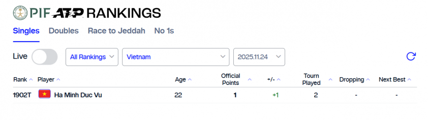 Điểm số của Minh Đức đến từ thành tích tại giải M15 Kuala Lumpur cách đây 2 tuần (điểm số các giải ITF World Tennis Tour thường được cập nhật chậm 1 tuần). Tại giải trên, tay vợt quê Hà Nội vượt qua 3 trận vòng loại, sau đó thắng trận nhà nghề đầu tiên trong năm 2025 khi vượt qua Daiki Yoshimura trước khi để thua hạt giống Karol Filar ở vòng 1/8.