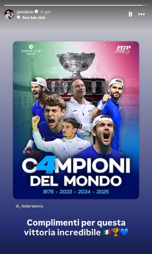 Ngay sau chiến thắng, Jannik Sinner đăng tải thông điệp ngắn gọn nhưng đầy ý nghĩa trên Instagram Stories: "Chúc mừng chiến thắng đáng kinh ngạc này". Lời chúc từ tay vợt số 1 nước Ý không chỉ khẳng định sự ủng hộ dành cho đồng đội mà còn cho thấy tinh thần đoàn kết của đội tuyển bất chấp sự thiếu vắng anh tại giải năm nay.
