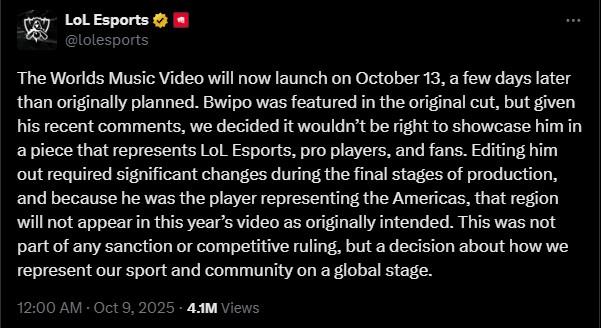 Tưởng chỉ là một drama nhỏ, hậu quả từ vụ việc của Bwipo đã lan rộng đến mức Riot Games phải "đau đầu". Trong thông báo mới nhất, Riot buộc phải hoãn phát hành MV chính thức của CKTG 2025 sang ngày 13/10, dù mọi khâu sản xuất đã hoàn tất. Lý do là bởi Bwipo xuất hiện trong MV với tư cách đại diện khu vực LTA. Giờ thì Riot buộc phải xóa hình ảnh của anh, chỉnh sửa lại toàn bộ video – công việc vừa tốn kém vừa chậm tiến độ.