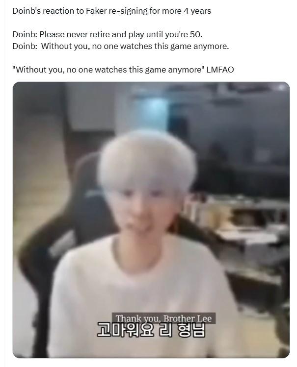 Trong một buổi livestream, Doinb đã không giấu được cảm xúc và thẳng thắn bày tỏ mong muốn Faker sẽ không giải nghệ. “Làm ơn đấy Lý ca (biệt danh của Faker tại khu vực LPL), anh đừng bao giờ giải nghệ. Hãy chơi đến năm 50 tuổi đi nhé, em cầu xin anh đó. Thật tuyệt khi biết rằng tôi và nhiều người khác có thể kiếm tiền với tựa game này thêm 4 năm nữa. LMHT gần đây đang ở tình trạng cực kỳ tồi tệ về cả lối chơi, trang phục... Nếu Lý ca mà nghỉ thì thì chẳng còn ai muốn theo dõi LMHT nữa và tôi không biết làm thế nào" - Doinb chia sẻ.