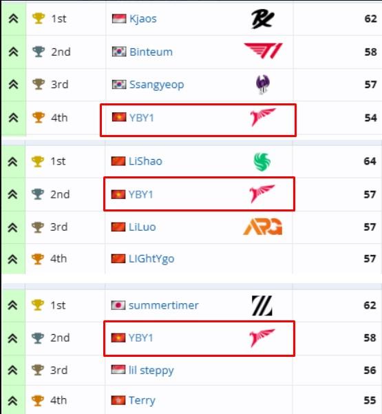 Hơn nữa, YBY1 đã lọt vào ngày thi đấu Chung kết ở cả 3 giải đấu ngoại hạng và chưa bao giờ phải chơi tới trận thứ 11 và 12 ở ngày 2 vòng loại. Thậm chí thành tích thấp nhất của YBY1 là hạng 5 và cho thấy tuyển thủ này đang nổi lên như một trong những kỳ thủ hàng đầu ở khu vực Pacific.