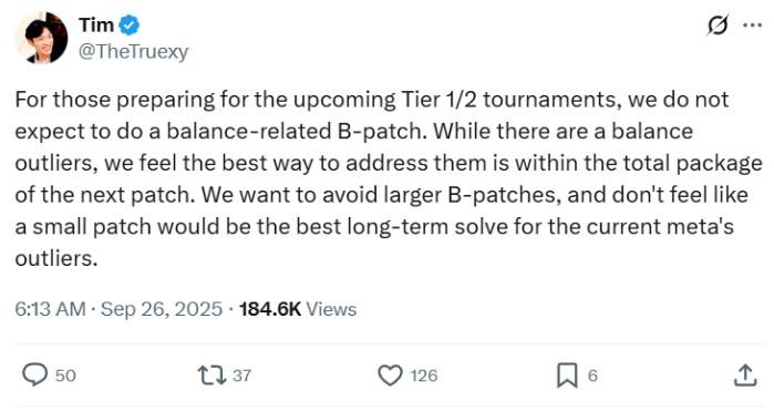 Trước sự hỗn loạn của meta, cộng đồng kỳ vọng Riot sẽ tung ra một bản hotfix để khắc phục. Tuy nhiên, đội ngũ phát triển bất ngờ thông báo: “Do sắp tới có nhiều giải đấu Tier 1/2, chúng tôi sẽ không ra bản vá nhỏ mà chờ đến bản 15.6 để cân bằng. Các bản vá b chỉ mang tính chắp vá, không phải giải pháp lâu dài".