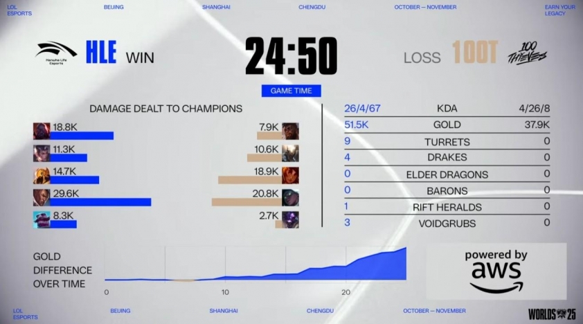 Cách đây ít phút, Hanwha Life Esports (HLE) đã có màn trình diễn hủy diệt khi “nghiền nát” 100 Thieves chỉ sau 24 phút 50 giây, qua đó tiến thẳng tới nhánh 2-1 tại vòng Swiss CKTG 2025. Đây là kết quả không quá bất ngờ khi HLE đang dần lấy lại phong độ trong khi 100T lại cho thấy mình dần bị bắt bài và không còn tạo ra được sự đột biến như trước.
