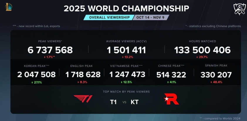 Theo báo cáo, lượng người xem cao nhất (Peak Viewers) của Worlds 2025 đạt 6,737,568, giảm 1,7% so với năm 2024. Đáng chú ý hơn, số lượng người xem trung bình (Average Concurrent Viewers) chỉ còn 1,501,411, tức giảm 13,2%, và tổng số giờ xem (Hours Watched) sụt giảm mạnh 29,7% — mức giảm sâu nhất trong nhiều năm gần đây.