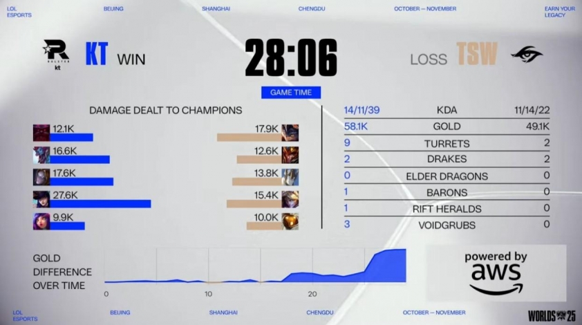 Trước khi vòng 2 của vòng Swiss CKTG 2025 diễn ra, TSW được nhận định là sẽ gặp khó khăn rất nhiều khi họ gặp phải KT, đại diện rất mạnh từ LCK. Tuy nhiên trong giai đoạn đầu trận, TSW đã thi đấu khá tự tin trước KT – một trong những đại diện mạnh của khu vực LCK. Họ kiểm soát tốt mục tiêu nhỏ với 2 rồng nguyên tố và 1 Sứ Giả Khe Nứt, đồng thời duy trì thế trận cân bằng suốt 15 phút đầu. Tuy nhiên, KT cho thấy kinh nghiệm vượt trội trong những pha di chuyển và giao tranh tổng, dần lấy lại quyền kiểm soát bản đồ.