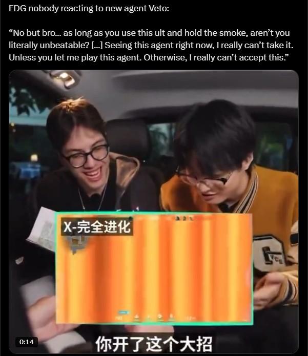 Khoảnh khắc này nhanh chóng trở thành meme trong cộng đồng Valorant quốc tế, khi người xem đồng loạt đồng tình rằng Veto sở hữu bộ kỹ năng quá mạnh. Đặc biệt, khả năng dịch chuyển liên tục, phá hủy kỹ năng đối thủ của agent mới này được cho là phá vỡ hoàn toàn thế cân bằng trong các tình huống giao tranh.
