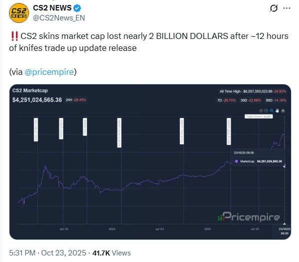 Theo dữ liệu từ PriceEmpire, market cap (tổng giá trị vật phẩm giao dịch) của CS2 đã tụt từ hơn 6 tỷ USD xuống còn khoảng 4 tỷ USD, tương đương việc bốc hơi hơn khoảng 2 tỷ USD – khoảng 52 nghìn tỷ đồng. Đây là mức giảm nhanh và mạnh nhất kể từ khi CS2 chính thức thay thế CS:GO.