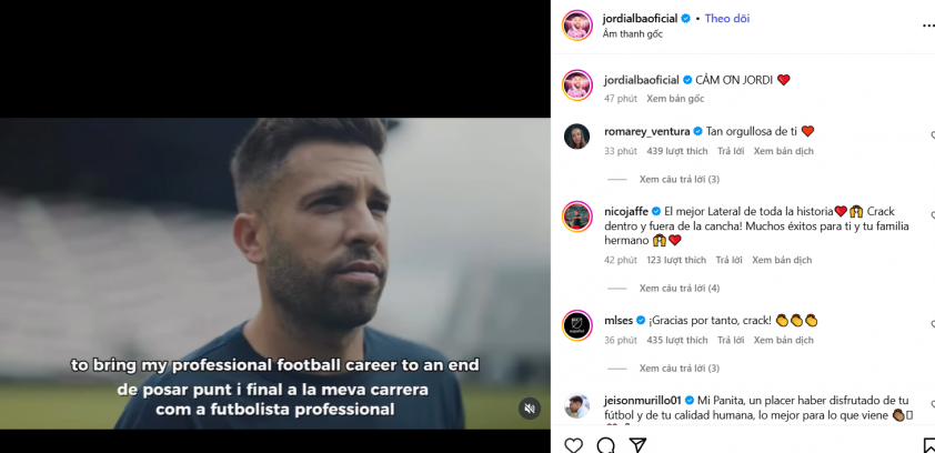 Hậu vệ kỳ cựu Jordi Alba, một trong những biểu tượng vĩ đại của Barcelona đã chính thức tuyên bố sẽ giải nghệ vào cuối mùa giải này, khi hợp đồng của anh với Inter Miami kết thúc. Thông tin được cầu thủ người Tây Ban Nha xác nhận trên trang Instagram cá nhân, khép lại hành trình hơn hai thập kỷ chinh chiến đỉnh cao.