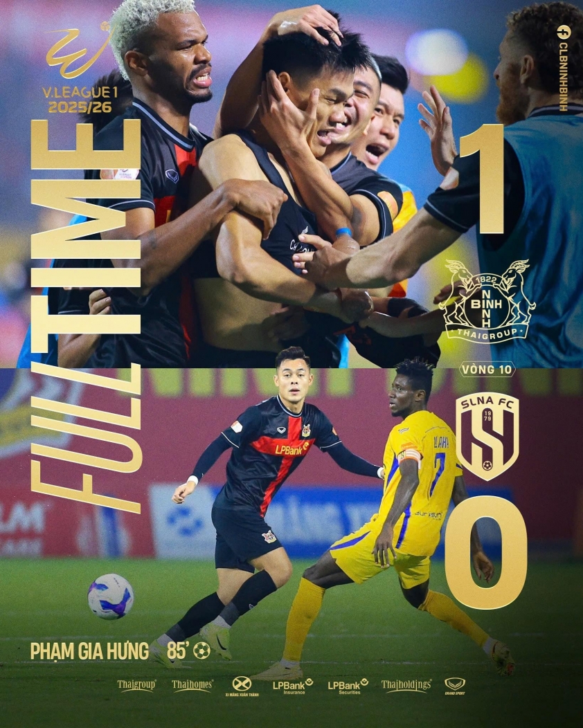 CLB Ninh Bình đã có chiến thắng nhọc nhằn 1-0 trước SLNA trong trận đấu tại vòng 10 V-League 2025/26, qua đó tiếp tục củng cố vị trí số 1 trên BXH.
