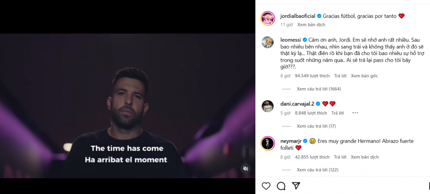 Trên Instagram cá nhân của Alba, siêu sao người Argentina để lại bình luận: “Cảm ơn cậu, Jordi. Tôi sẽ rất nhớ cậu. Sau tất cả những gì chúng ta đã trải qua, thật lạ khi nhìn sang bên trái và không còn thấy cậu ở đó nữa.” Messi còn hóm hỉnh nhắc lại mối liên kết đặc biệt giữa hai người trên sân: “Thật điên rồ khi nghĩ đến số pha kiến tạo mà cậu đã dành cho tôi suốt những năm qua... Giờ ai sẽ chuyền những quả bóng đó cho tôi đây?”